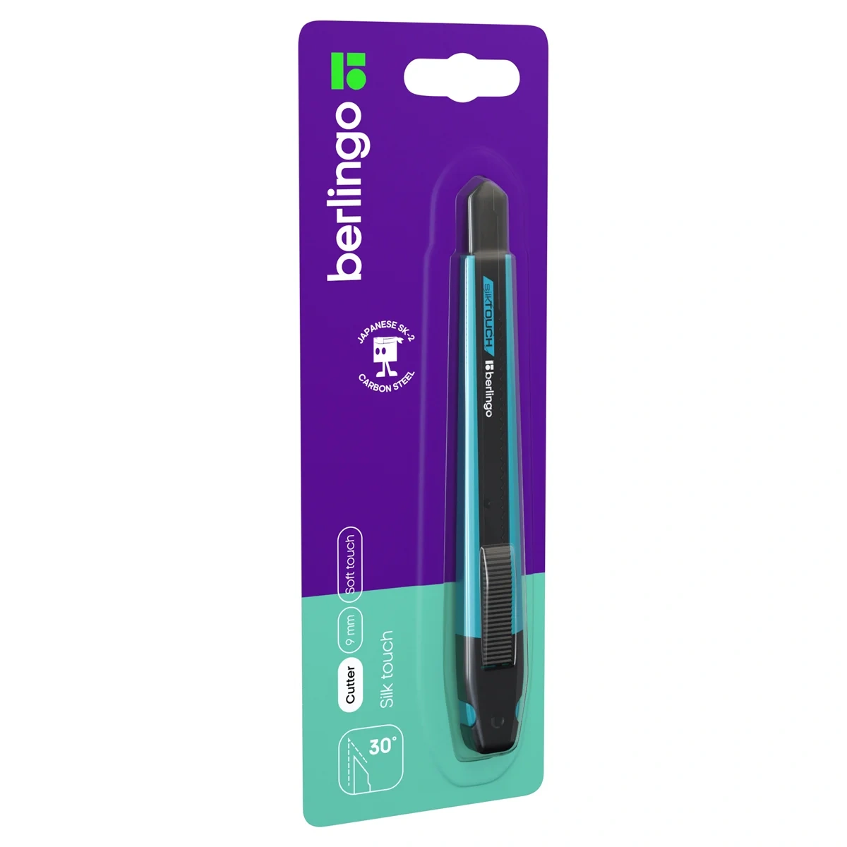 Серия 'SilkTouch'. Нож канцелярский с автоматической системой фиксации лезвия auto-lock. Корпус ножа выполнен из высококачественного ABS пластика c софт-тач покрытием. Цвет корпуса - бирюзовый. Комплектуется износостойким лезвием черного цвета из стали SK2 с углом 30°. Ширина лезвия - 9 мм. Оснащен металлическими направляющими для плавного движения лезвия. Индивидуальная упаковка - блистер с европодвесом.
