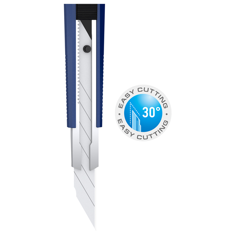 Серия 'Hyper'. Нож канцелярский с автоматической системой фиксации лезвия auto-lock. Корпус ножа выполнен из высококачественного ABS пластика. Цвет корпуса - синий. Комплектуется износостойким лезвием из стали SK5 с углом 30°. Ширина лезвия - 9 мм. Оснащен металлическими направляющими для плавного движения лезвия. Индивидуальная упаковка - блистер с европодвесом.