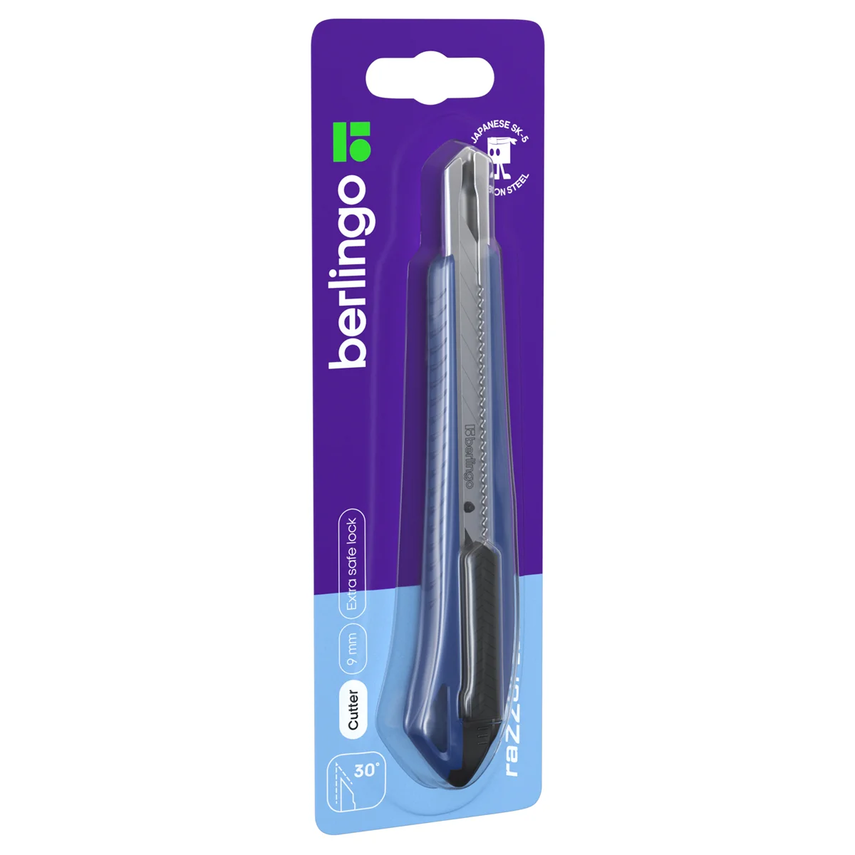 Нож канцелярский 9мм Berlingo 'Razzor 200', auto-lock, металл. направл., синий, европодвес