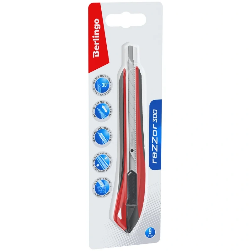Нож канцелярский 9мм Berlingo 'Razzor 300', auto-lock, металл. направл., мягкие вставки, красный, ев