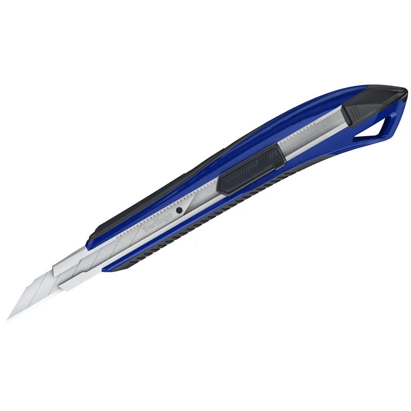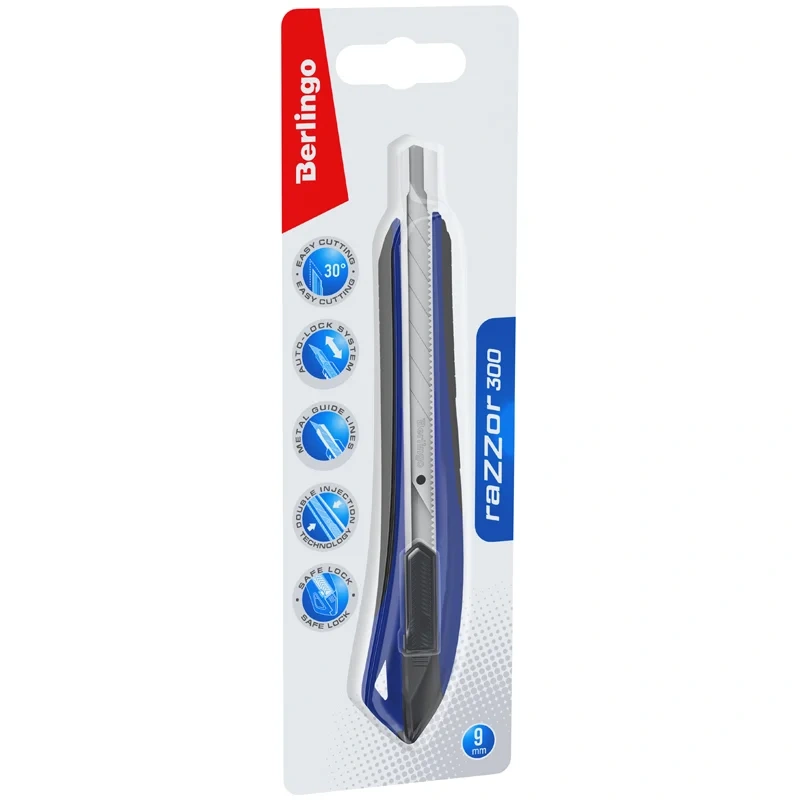 Нож канцелярский 9мм Berlingo 'Razzor 300', auto-lock, металл. направл., мягкие вставки, синий, евро