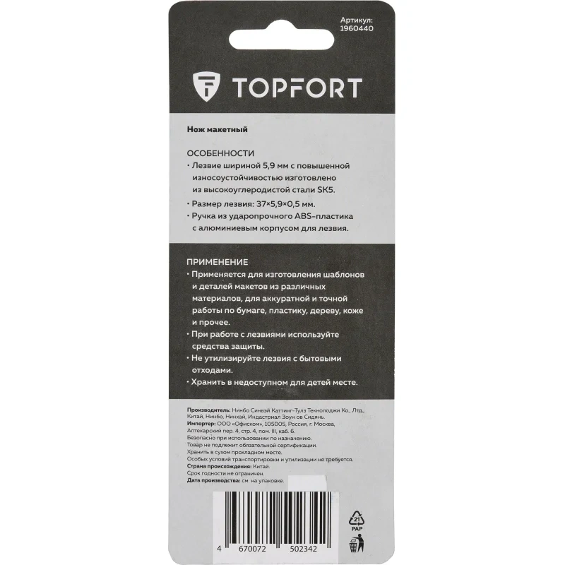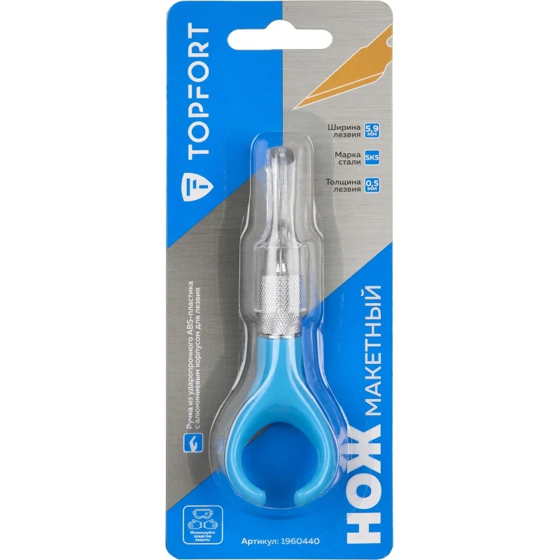 Нож-скальпель макетный мини TOPFORT с шириной лезвия 5,9 мм. Ручка ножа из ударопрочного ABS-пластика с алюминиевым корпусом для лезвия. При помощи ножа-скальпеля можно эффективно и с минимальными усилиями резать любые материалы: бумагу, обои, картон, пленку, кожу, дерево и даже пластик. Макетный нож подходит для проведения художественных и дизайнерских работ: декупажа, квиллинга, скрапбукинга, пэчворка и декорирования резными элементами. Нож оснащен колпачком для безопасного хранения и транспортировки. Для обеспечения оптимального срока службы лезвия используйте нож с защитным ковриком для резки TOPFORT. Он защищает рабочие поверхности, а также продлевает срок службы лезвия. Рекомендуем приобрести дополнительные лезвия — арт. 1960453 (10 штук в упаковке).