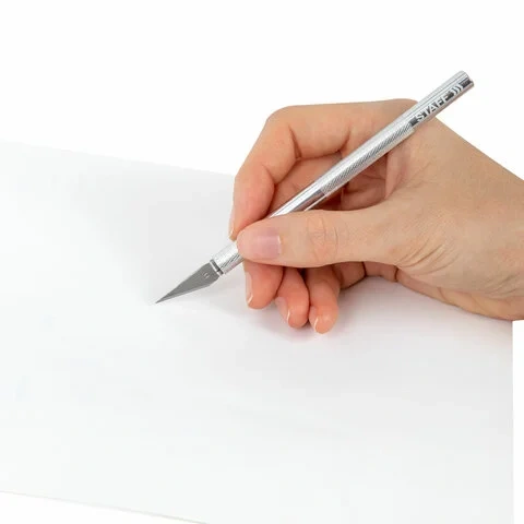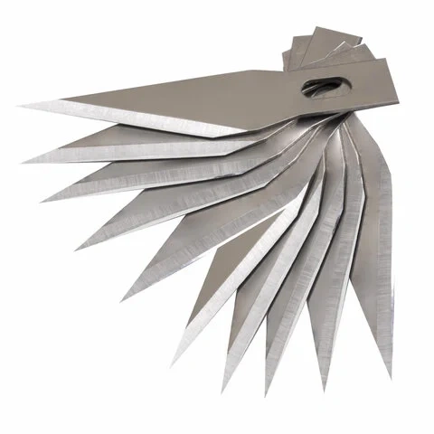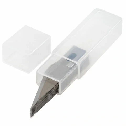 Ультратонкое металлическое лезвие с заостренным кончиком закрывается колпачком по окончании работы. Ширина лезвия составляет 8 мм. Поставляется в блистере с европодвесом. 10 запасных лезвий в комплекте.