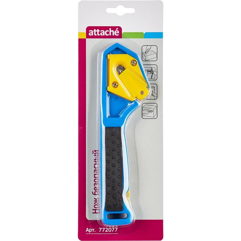 Нож безопасный Attache для разрезания скотча, термоусадочной пленки, пластиковых ремней, прокладочного материала. На ноже имеется ограничитель в форме клюва для безопасного вскрытия упаковки.