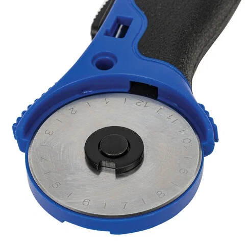 Острое вращающееся лезвие диаметром 45 мм обеспечивает точный раскрой, а регулировочный винт изменяет степень вращения лезвия: от свободного вращения до полной фиксации.