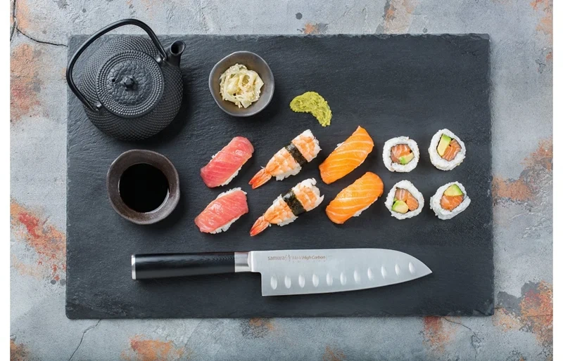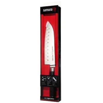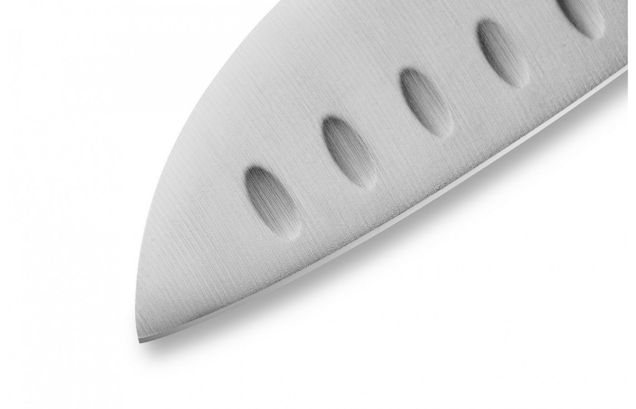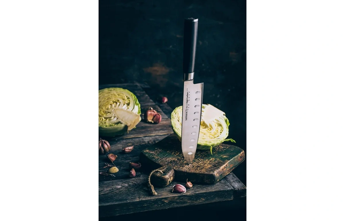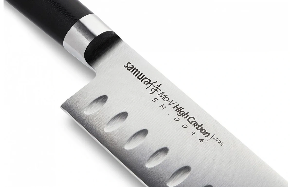 Нож сантоку Samura Mо-V, 18 см широким массивным клинком из однослойной стали – идеальный нож для нарезки, шинковки и нарезки продуктов. А еще с помощью его обуха очень удобно пересыпать с разделочной доски нарезанные кусочки овощей или мяса. На клинке над режущей кромкой расположен ряд овальных выемок. Они выполняют роль воздушных карманов, уменьшая площадь соприкосновения с продуктом. Так предотвращается раздражающее и мешающее работе налипание пищи на лезвие. В общем-то, благодаря такой особенности все манипуляции выполняются легко и быстро.