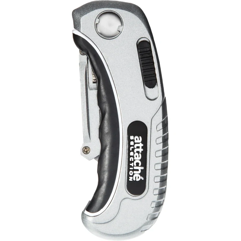 Нож универсальный многофункциональный Attache Selection с трапециевидным лезвием предназначен для резки широкого спектра материалов, таких как ткань, бумага, кожа, пленка и другие. Эргономичный и надежный корпус выполнен из цинкового сплава, с вставками из термопластичного каучука (TPR) и ударопрочного ABS-пластика, что препятствует соскальзыванию пальцев.