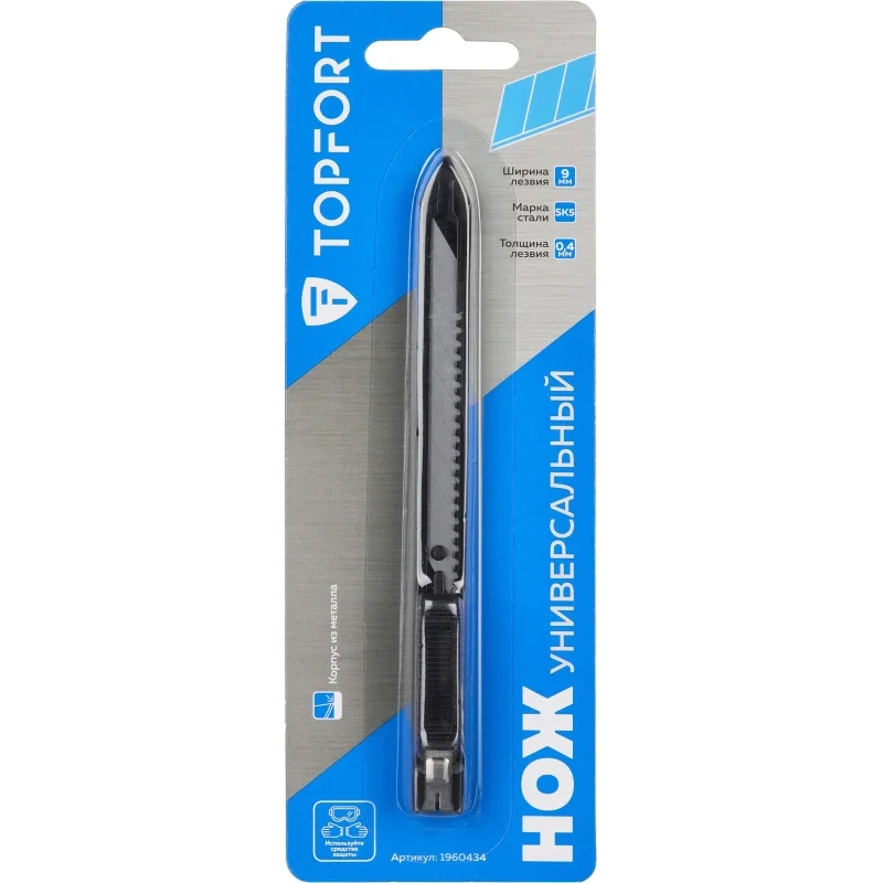 Нож универсальный TOPFORT с сегментированным лезвием шириной 9 мм. Надежный корпус из металла. Используется для резки широкого спектра материалов: ткани, бумаги, кожи, пленки и т.п. Рекомендуем приобрести дополнительные лезвия — арт. 1960449 (10 штук в упаковке).