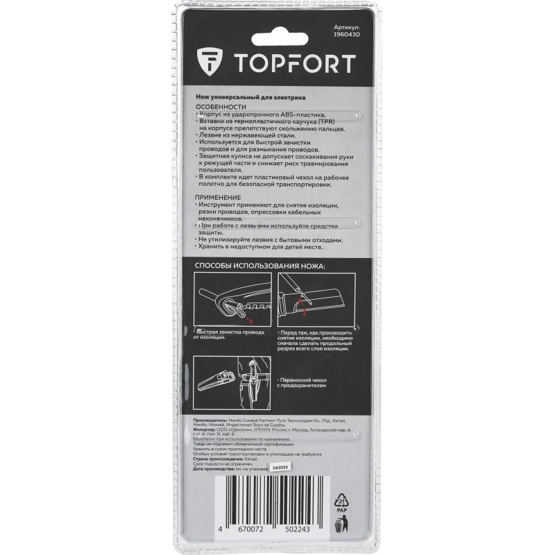 Нож монтерский TOPFORT с кобурой (пластиковый чехол). Применяется для снятия изоляции, для размыкания проводов, резки проводов, опрессовки кабельных наконечников. Эргономичный, надежный корпус из ударопрочного ABS-пластика со вставками из термопластичного каучука (TPR) на корпусе препятствуют скольжению пальцев. Защитная кулиса не допускает соскакивания руки к режущей части и снижает риск травмирования оператора.