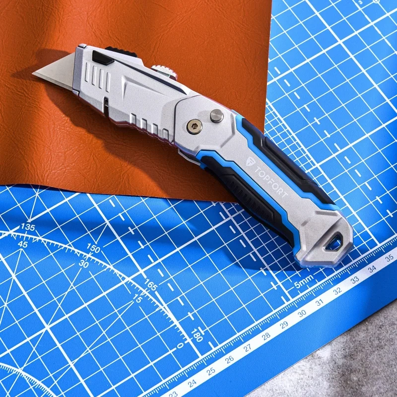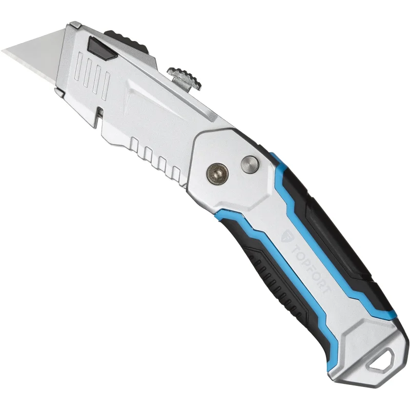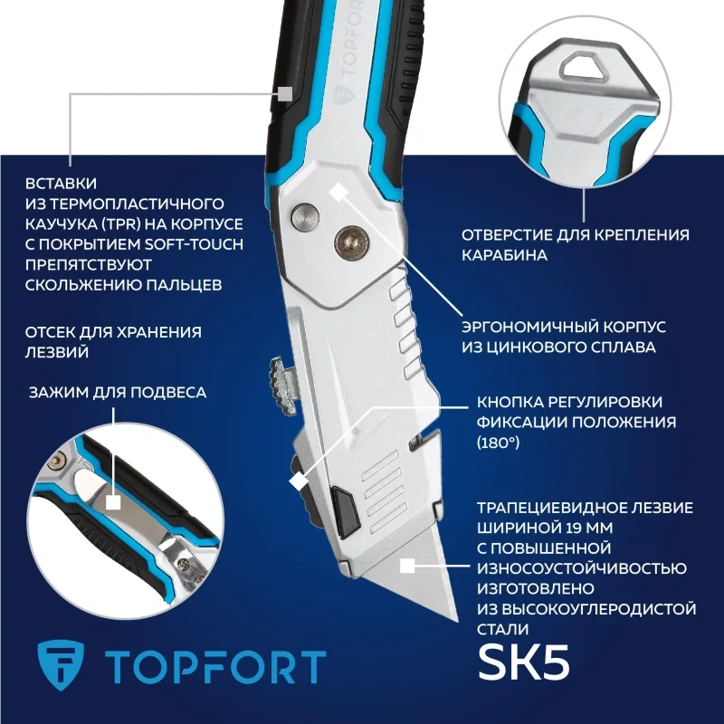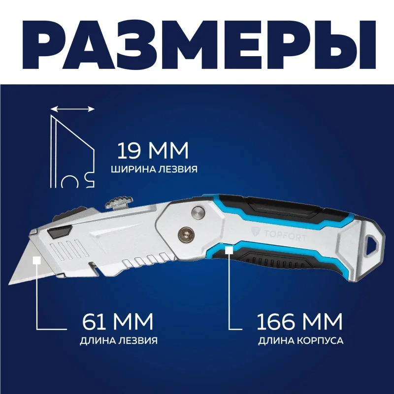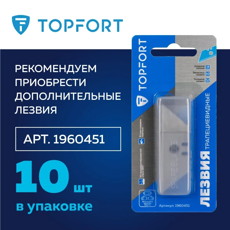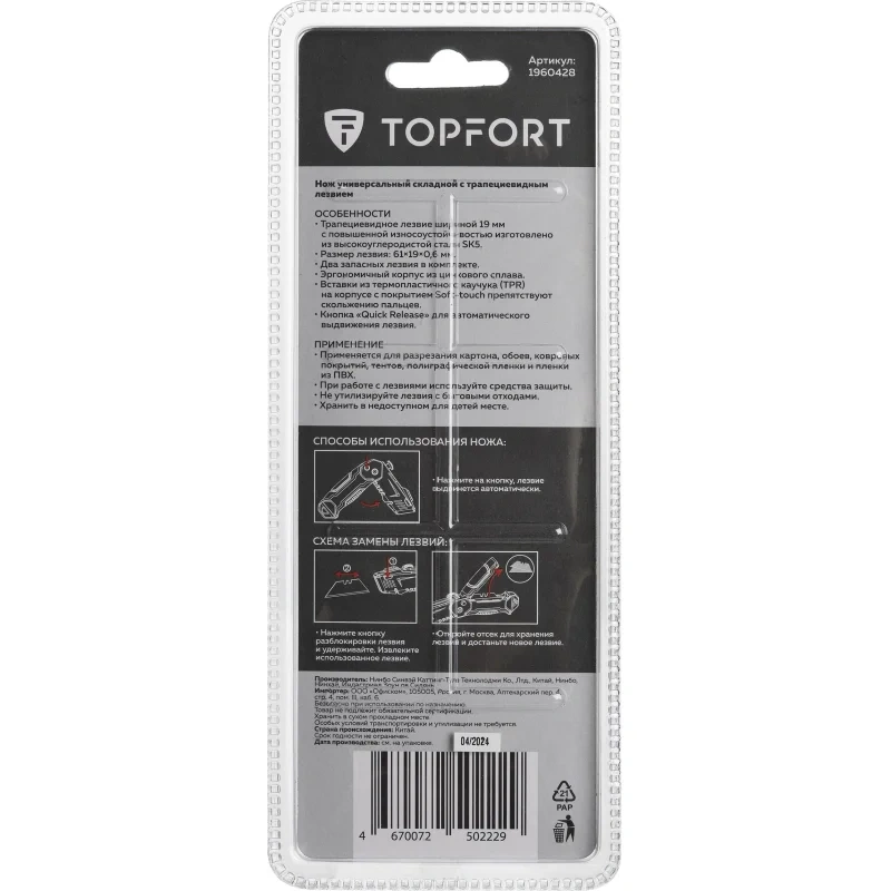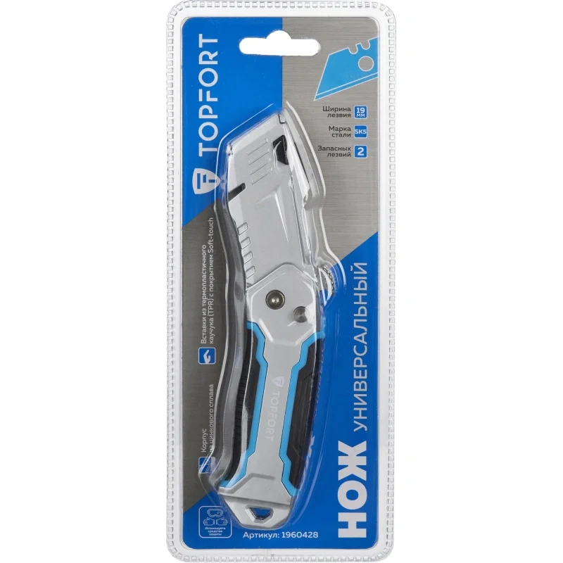Нож универсальный TOPFORT складной с трапециевидным лезвием шириной 19 мм. Эргономичный, надежный, прочный корпус из цинкового сплава со вставками из термопластичного каучука (TPR) на корпусе с покрытием Soft-touch препятствуют скольжению пальцев. Применяется для разрезания картона, обоев, ковровых покрытий, тентов, полиграфической пленки и пленки из ПВХ, для вскрытия стрейч-пленки, коробок, разрезания шпагатов и стреппинг-ленты. Рекомендуем приобрести дополнительные лезвия — арт. 1960451 (10 штук в упаковке).