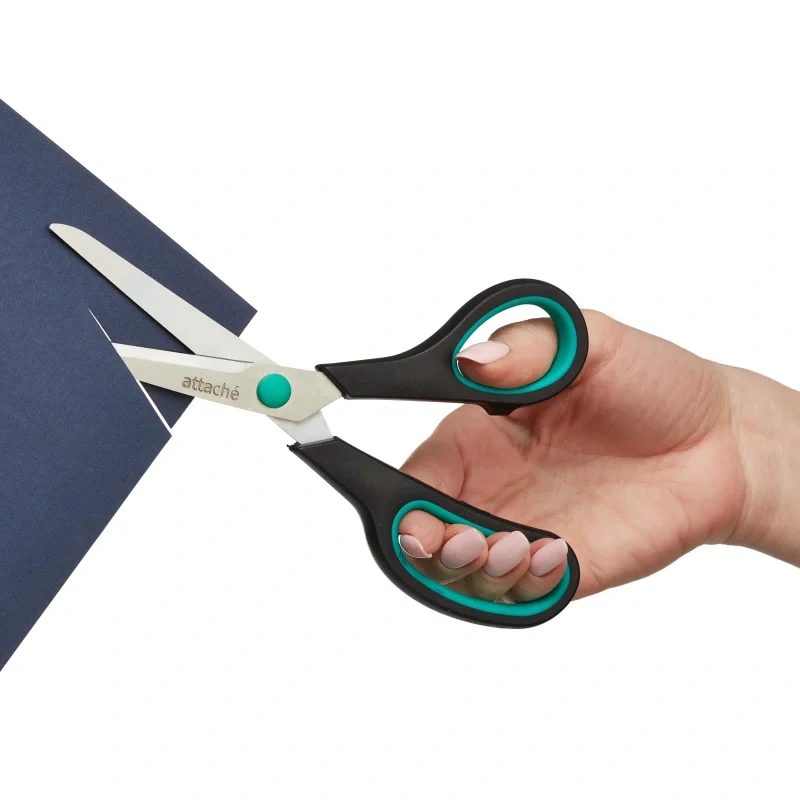 Канцелярские ножницы (офисные) Attache имеют лезвия, выполненные из стали. Для оформления ручек выбрана комбинация из двух цветов: черный и бирюзовый. Кольца анатомической формы с резиновыми вставками предотвращают скольжение пальцев. Двухсторонняя заточка лезвий.