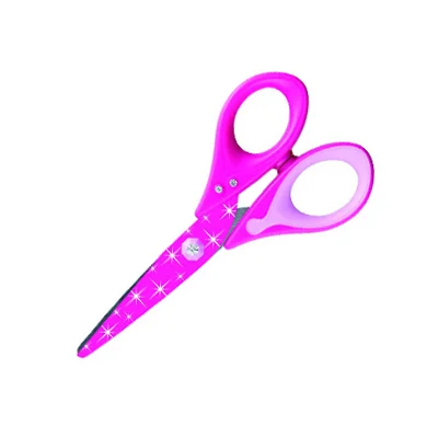 Ножницы с устойчивым декоративным покрытием. 2 типа дизайна: ручка в виде колеса для мальчиком, стразы для девочек. Симметричные. С европодвесом.