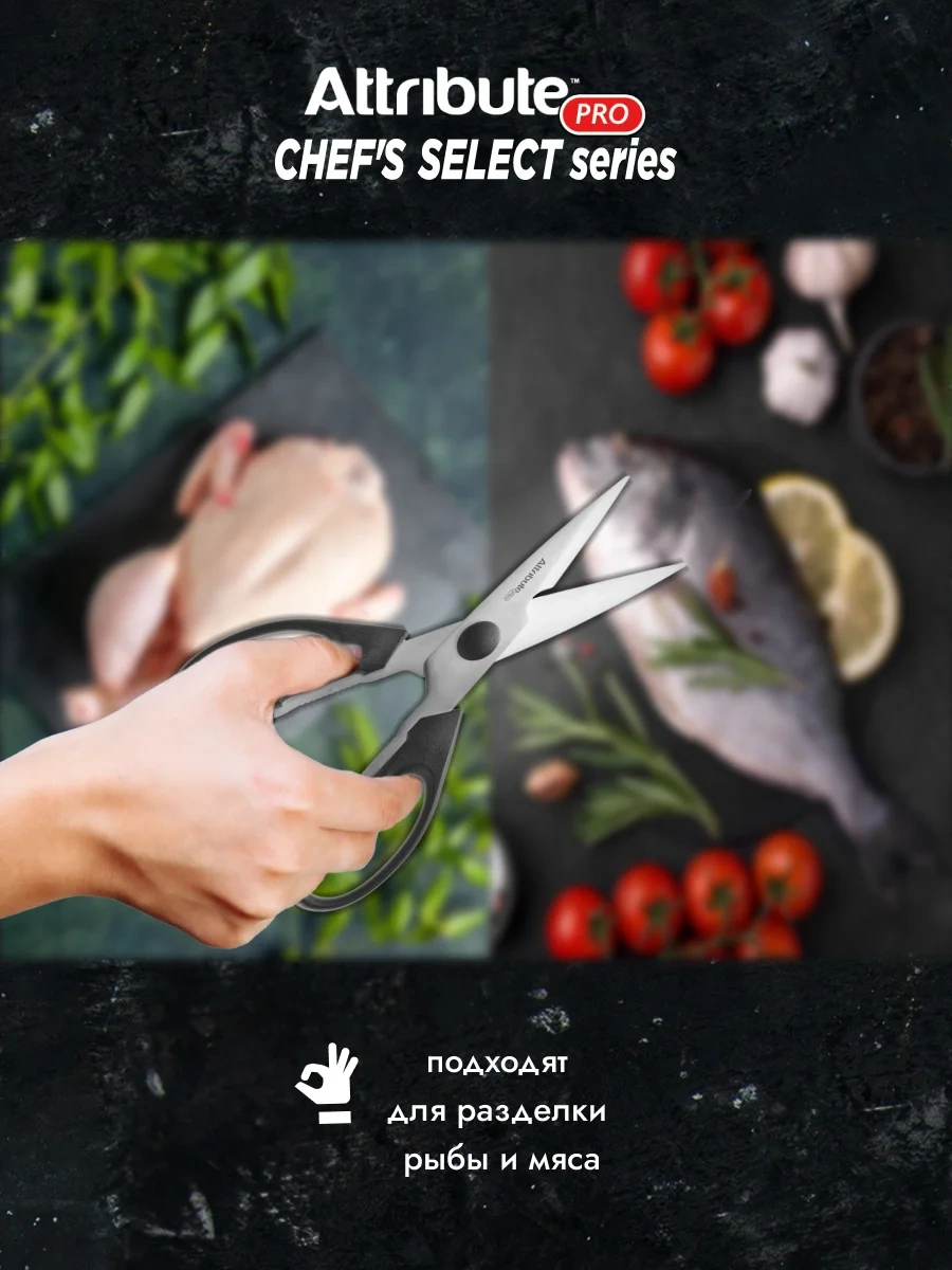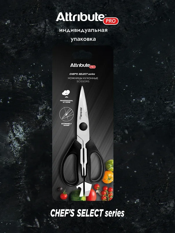 Ножницы Attribute Chef's Select универсальные могут использоваться для резки пищевых продуктов, таких как мясо, рыба, овощи, фрукты и т. д. Они идеально подходят для удаления птичьей кожи или нарезки зелени и специй. Благодаря острым лезвиям и прочной конструкции, они также могут использоваться для открытия упаковок, разделки птицы. Кухонные ножницы также имеют открывалку, которой удобно открывать консервы и бутылки. Изделие выполнено из прочной стали, поэтому ими легко открывать упаковки, разделывать рыбу, мясо и птицу и не бояться того, что ножницы сломаются. Мелкие зубчики на лезвиях необходимы для удержания скользких предметов: сырое мясо или рыба, продукты в полиэтиленовых пакетах. Ножницы оснащены у основания лезвий специальной выемкой – ключом для открывания бутылок и банок с железными крышками. Пространство между ручками можно применять для колки орехов.