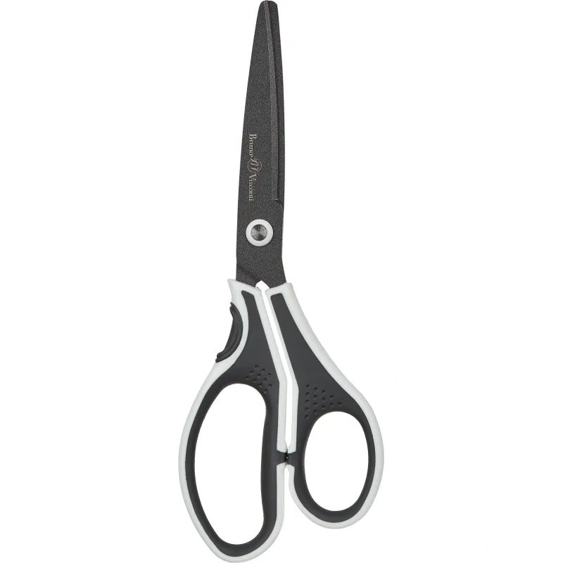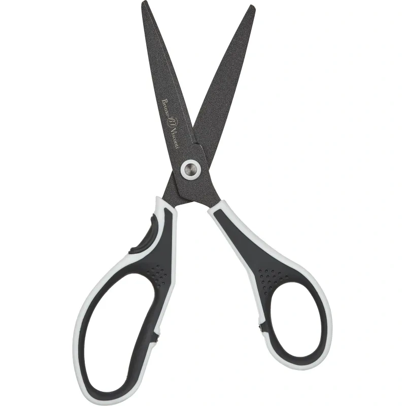 Максимально удобные для работы в офисе или при создании декоративных поделок ножницы Bruno Visconti Finecut. Они изготовлены из нержавеющей стали со специальным тефлоновым покрытием, позволяющим работать с липкими и самоклеящимися материалами. С их помощью можно легко разрезать бумагу на клеевой основе, скотч — они гарантированно не прилипнут и не оставят липкий след на лезвиях. Рукоятки ножниц «Finecut» эргономичной формы, но разработчики пошли дальше и дополнили их характеристиками, благодаря которым максимальный комфорт в работе с ножницами обеспечен: мягкое, бархатистое покрытие из термопластичной резины и прорезиненная выемка под указательный палец по краю рукоятки. Плавность хода инструмента гарантирует надежный элемент крепления, спрятанный под заглушкой.