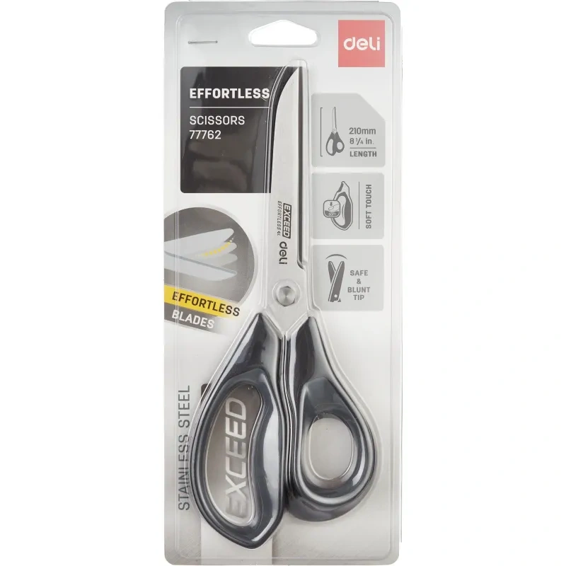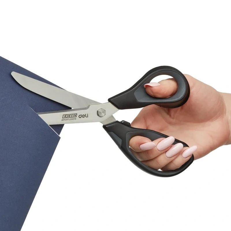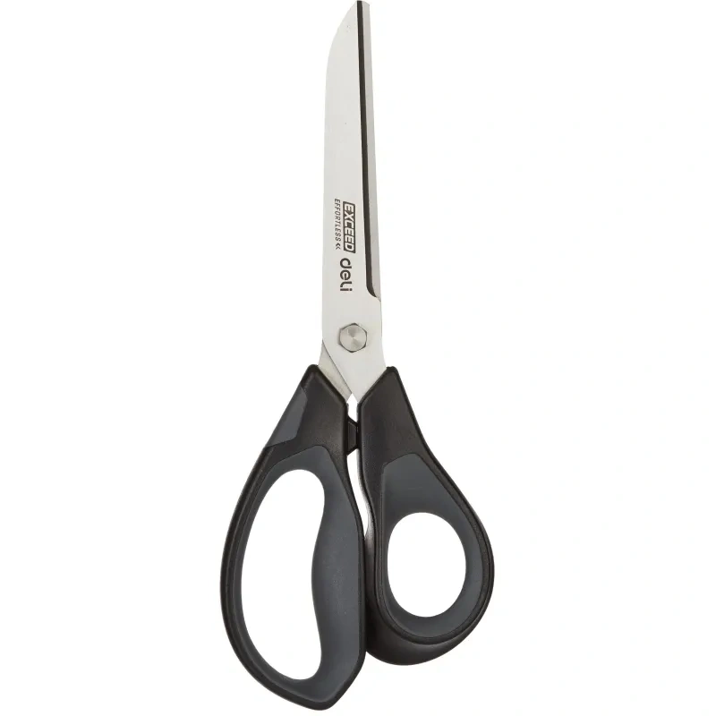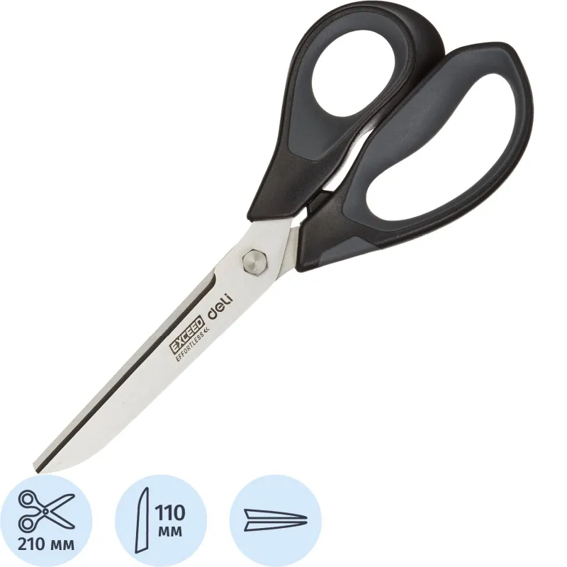 Ножницы Deli подходят для работы в офисе, школе и дома. Удобная конструкция позволяет свободно работать с бумагой, картоном, скотчем и тканями. Оптимальное сочетание размера и качество ножниц определяют выбор покупателей по всему миру. Пластиковые кольца удобной эргономичной формы с прорезиненными вставками позволяют максимально комфортно осуществлять любые работы с ножницами. Ножницы размером 210 мм имеют асимметричную форму колец для удобного захвата правой рукой при работе и снижении напряжения. Лезвия выполнены из нержавеющей стали, благодаря чему долгое время остаются острыми.