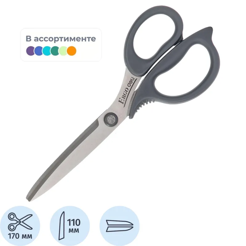 Ножницы канцелярские бренда Deli универсального назначения — один из необходимых помощников как дома, так и в офисе при работе с бумагой и другими материалами. Лезвия изготовлены из нержавеющей стали, с возможностью двухсторонней заточки. Ручки эргономичной формы изготовлены из пластика. Длина лезвий: 110 мм. Длина ножниц: 170 мм. Форма лезвий: тупоконечные. Вид колец: разные.