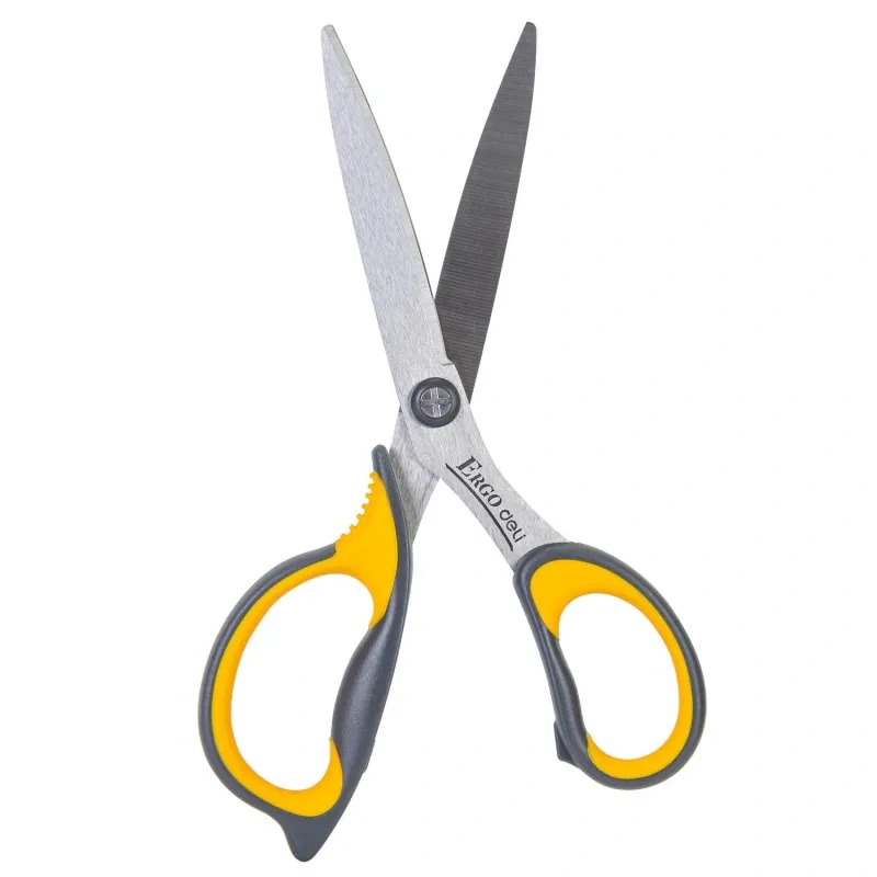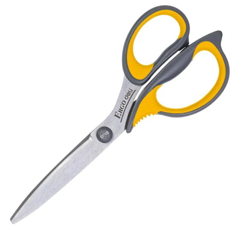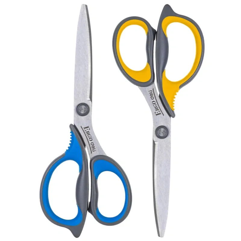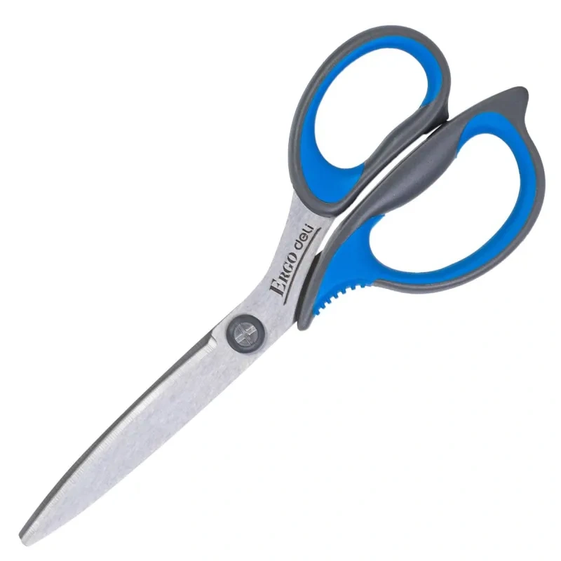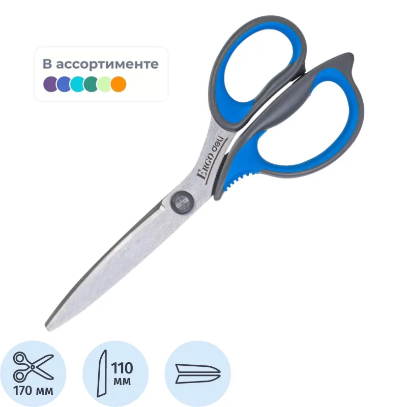 Ножницы канцелярские бренда Deli универсального назначения — один из необходимых помощников как дома, так и в офисе при работе с бумагой и другими материалами. Лезвия изготовлены из нержавеющей стали, с возможностью двухсторонней заточки. Пластиковые ручки эргономичной формы снабжены прорезиненной вставкой для удобства пользования. Длина лезвий: 110 мм. Длина ножниц: 170 мм. Форма лезвий: тупоконечные. Вид колец: разные.