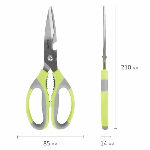 Прочные лезвия толщиной 2,5 мм из нержавеющей пищевой стали, соединены усиленной осью, что исключает зазор и люфт, обеспечивая точность реза. Изделие снабжено эргономичными пластиковыми ручками с противоскользящими вставками, обеспечивающими надежный захват инструмента при работе и препятствующими выскальзыванию его из рук. Легко моется, не впитывает посторонние запахи, можно мыть в посудомоечной машине. Общая длина – 210 мм. Оснащены открывашкой для бутылок, механизмом для колки орехов и серрейторной заточкой для резки ткани и веревок.