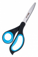 Лезвия ножниц выполнены из нержавеющей стали. Имеют асимметричные ручки с резиновыми вставками, обеспечивающими комфортную работу с материалами разной плотности. Размер ножниц 22,8 см.
