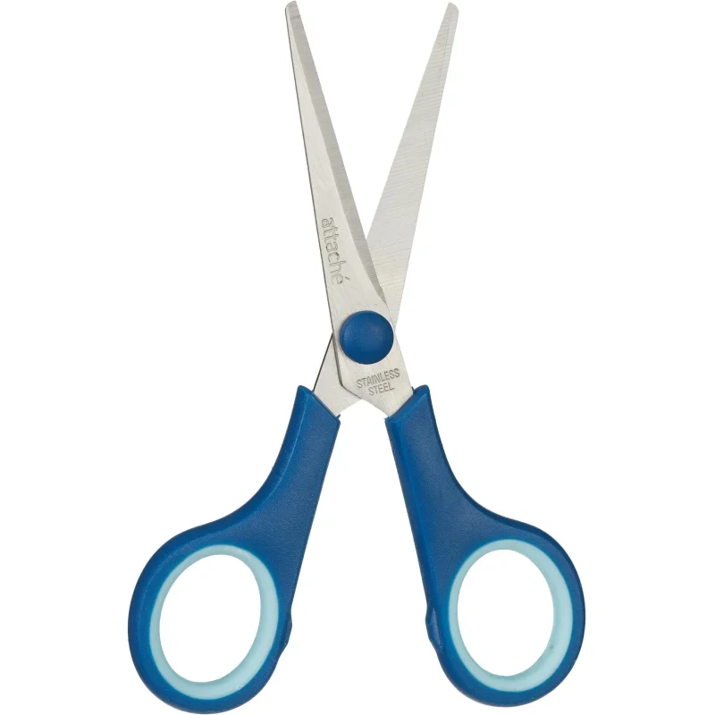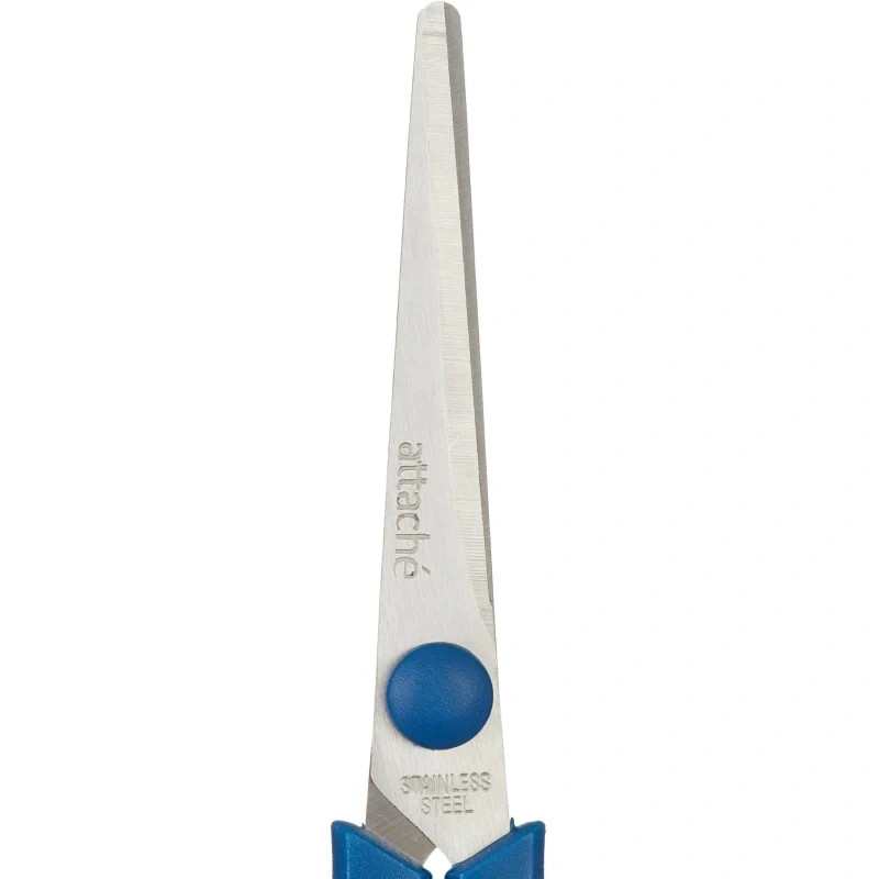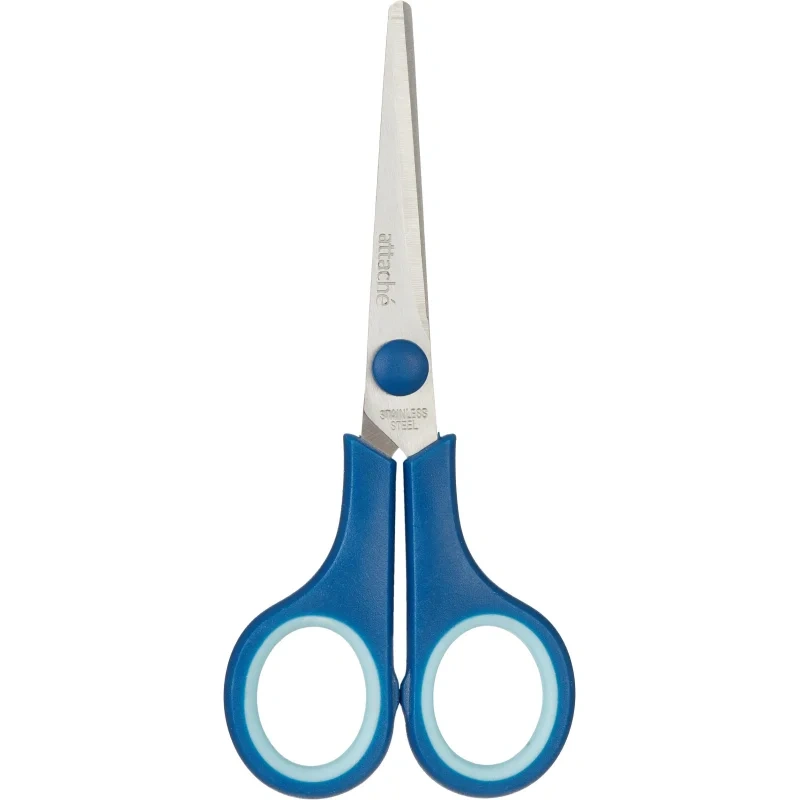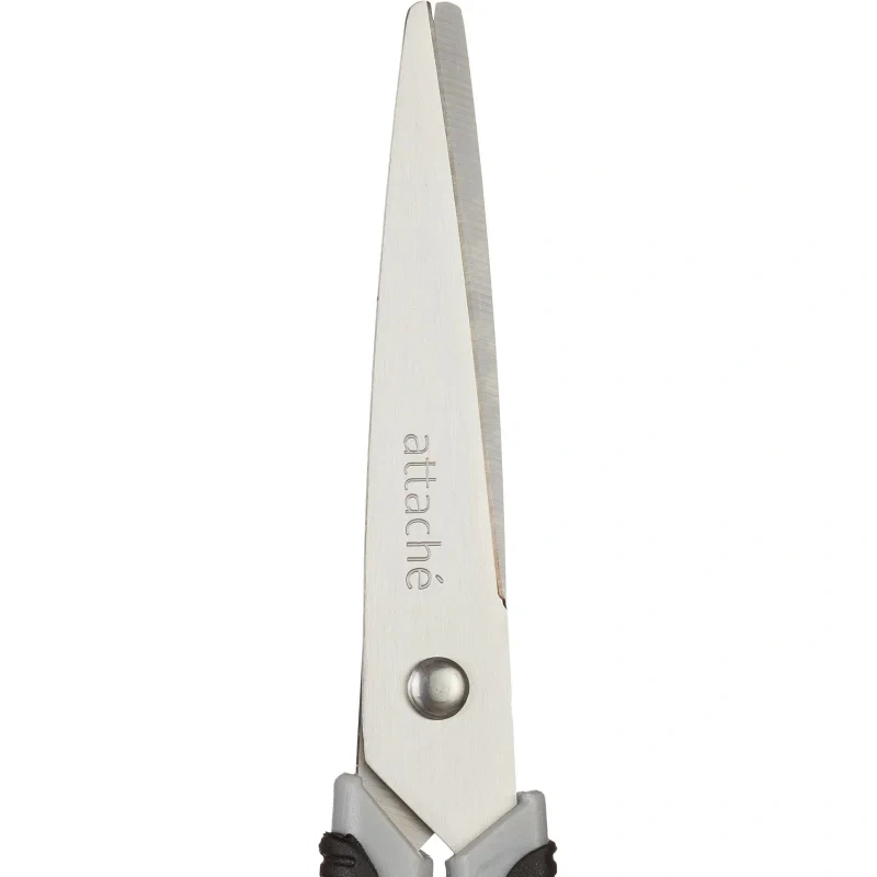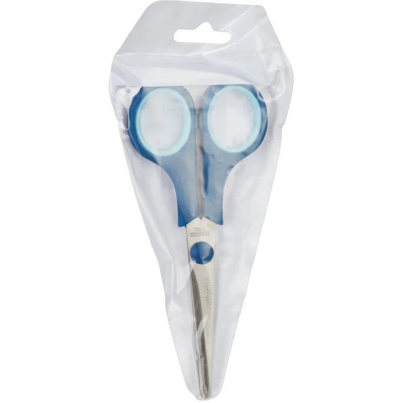 Лезвия ножниц выполнены из нержавеющей стали. Имеют асимметричные ручки с резиновыми вставками, обеспечивающими комфортную работу с материалами разной плотности. Размер ножниц 22,8 см.