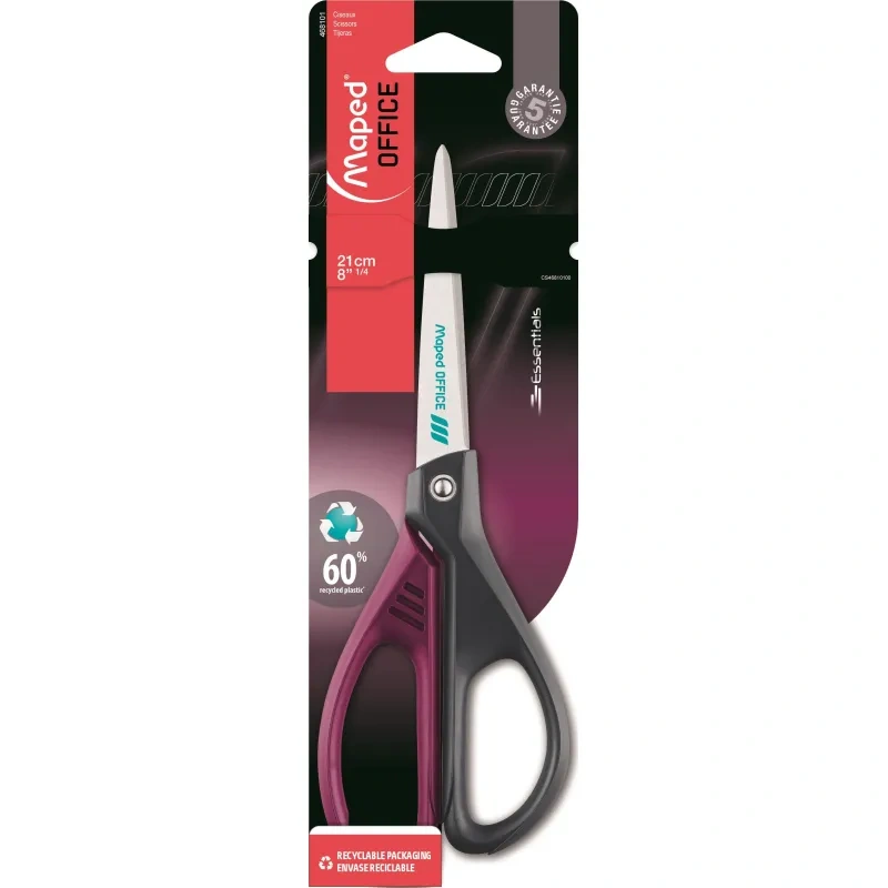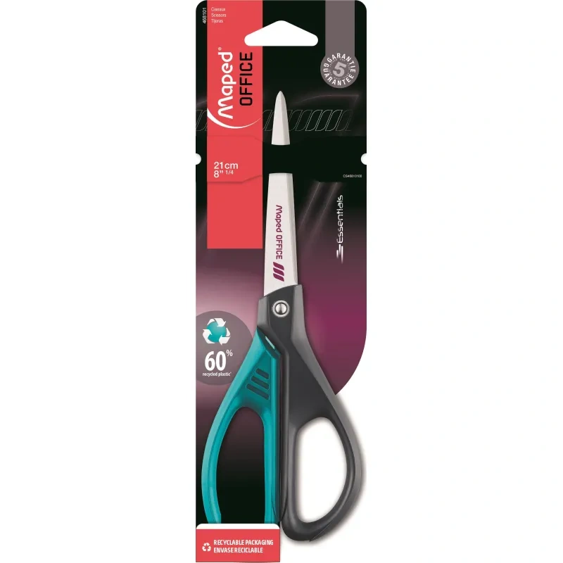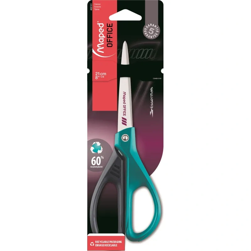 Ножницы Maped Essentials Green Deco 21 см. Лезвия и заклепка из высококачественной нержавеющей стали, симметричные. 2D эргономичные кольца изготовлены из переработанного пластика. Заостренные концы лезвий. Ножницы поставляются в эколоничной упаковке с европодвесом. Внимание! Товар поставляется в нескольких цветовых вариантах (без возможности выбора).