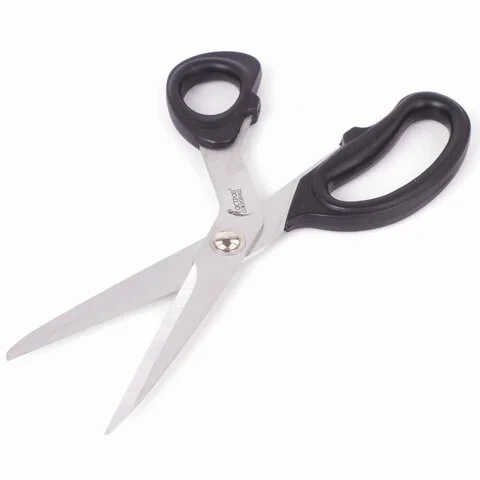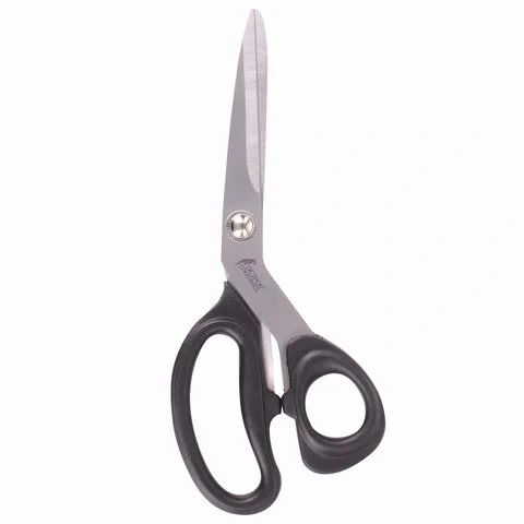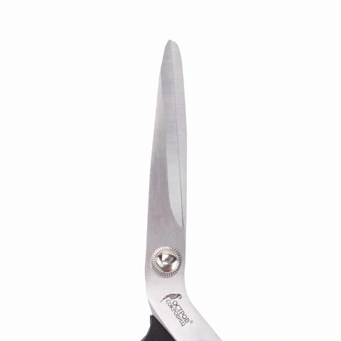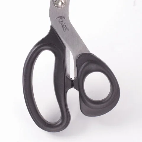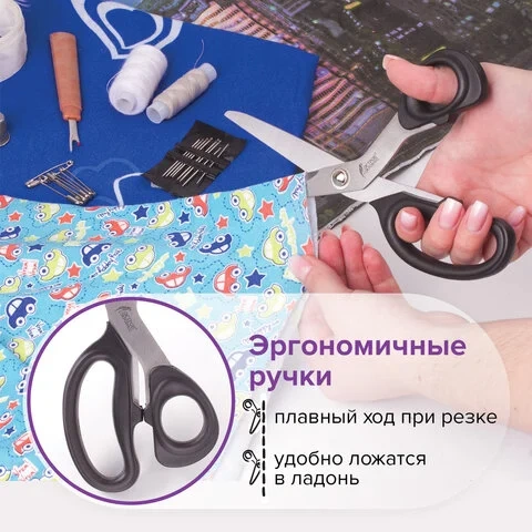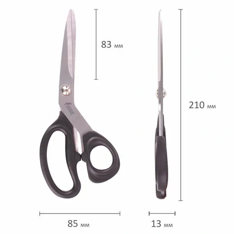 Эргономичные пластиковые ручки удобны в использовании. Лезвия выполнены из нержавеющей стали. Общая длина ножниц составляет 210 мм, позволяя выкраивать мелкие детали.