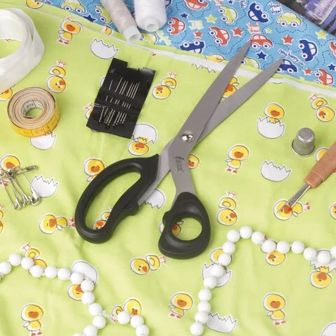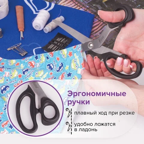 Эргономичные пластиковые ручки удобны в использовании. Лезвия выполнены из нержавеющей стали. Общая длина ножниц составляет 230 мм, позволяя выкраивать мелкие детали.