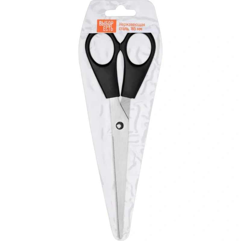 Ножницы универсальные Выбор есть 165 мм пластиковые ручки черного цвета. Универсальные ножницы Выбор есть — это практичный инструмент для решения множества бытовых задач. Особенности изделия: оптимальная длина 165 миллиметров — удобны для большинства видов работ. Универсальность: подходят для резки бумаги, картона, ткани, нитей и других материалов. Прочные лезвия изготовлены из нержавеющей стали, что обеспечивает долговечность и стойкость к коррозии. Двухсторонняя заточка обеспечивает аккуратный и ровный рез. Безопасность: тупоконечные лезвия снижают риск травмирования. Пластиковые ручки черного цвета обеспечивают комфортный хват. Ножницы Выбор есть — надженый помощник дома и в офисе!