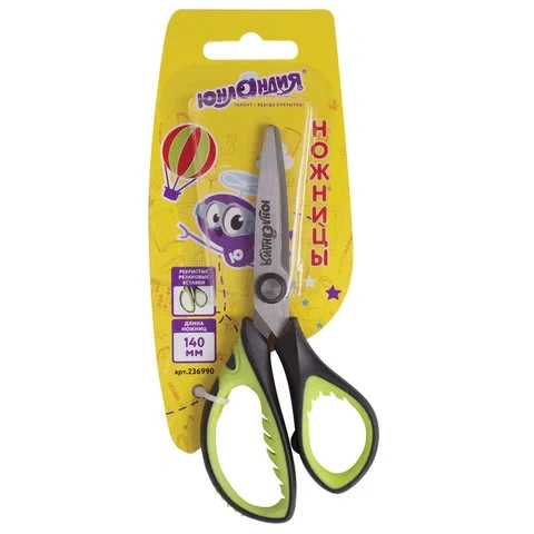 Ножницы ЮНЛАНДИЯ с эргономичными ручками помогают уменьшить нагрузку на руку ребенка при интенсивной и продолжительной работе, а ребристые резиновые вставки яркого салатового цвета не позволяют пальцам скользить во время использования.