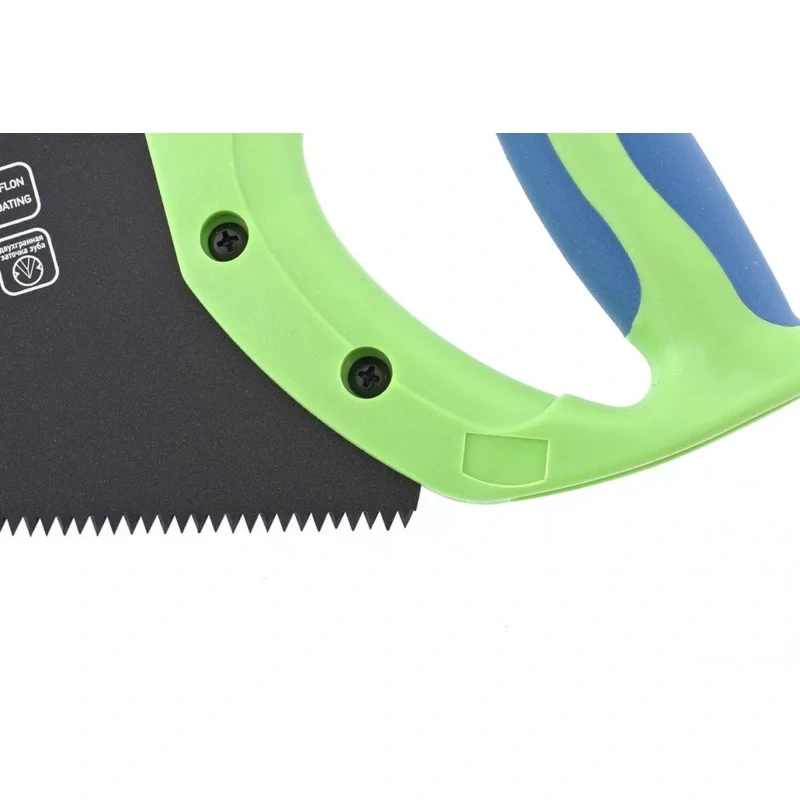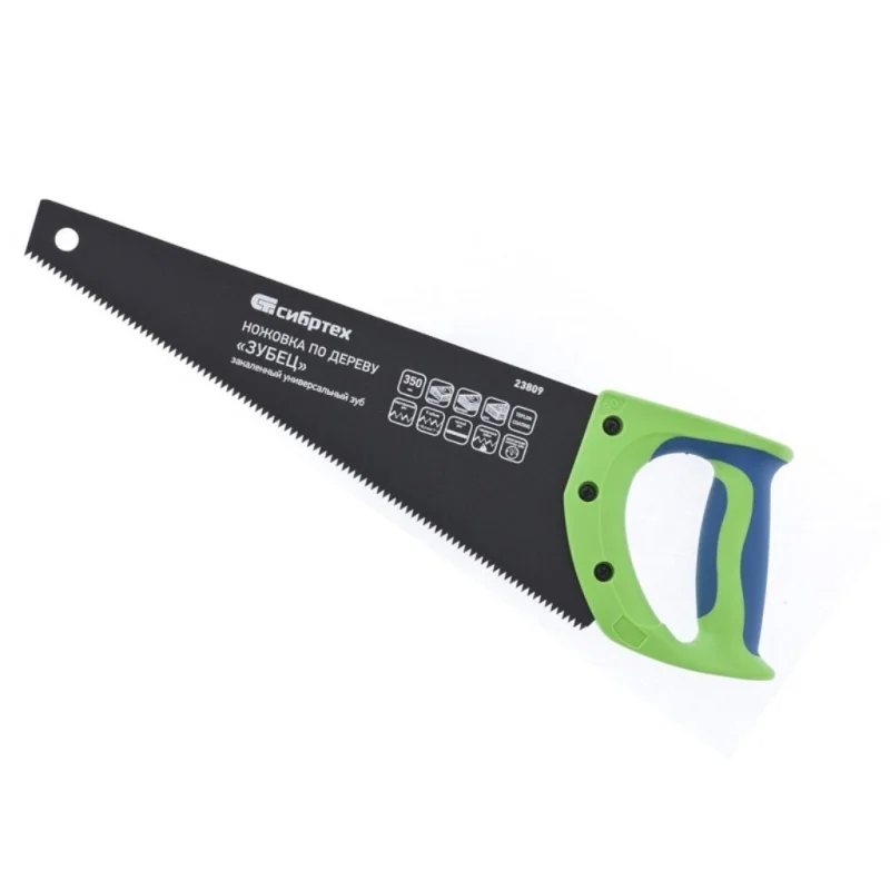 Ножовка Сибртех по дереву 350 мм с закаленными зубьями (23809) стандартная, без дополнительной комплектации, с широким полотном, полотно инструмента с защитным покрытием изготовлено из легированной стали и имеет зуб с двухгранной заточкой. Количество зубьев на дюйм-7 . Зубья ножовки закалены. Двухкомпонентная рукоятка изготовлена из ударопрочной пластмассы, крепится тремя винтами к полотну. Используется при продольном и поперечном пилении древесины.