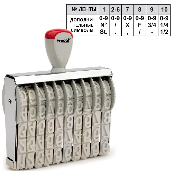 Обеспечивает 10-значный оттиск. Каждая лента содержит цифры от 0 до 9, а также имеет дополнительные символы.