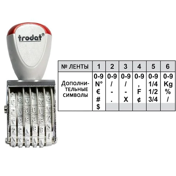 Обеспечивает 6ти-значный оттиск. Каждая лента содержит цифры от 0 до 9, а также имеет дополнительные символы.