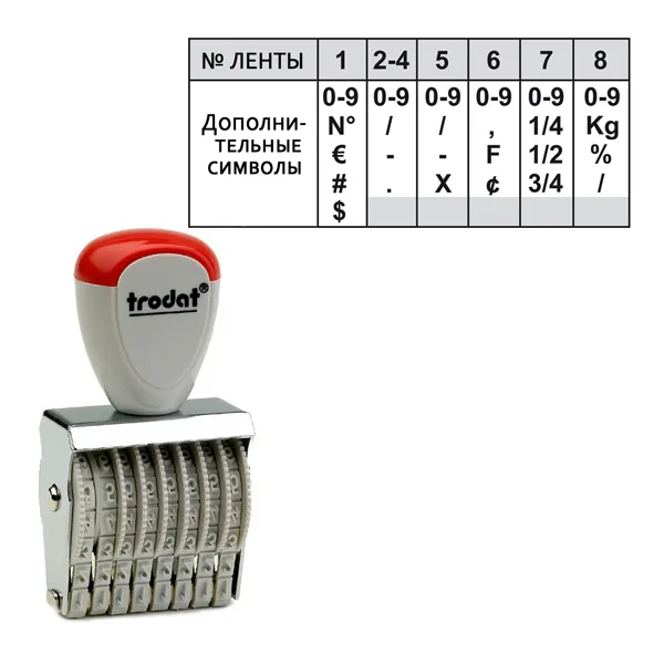 Обеспечивает 8ми-значный оттиск. Каждая лента содержит цифры от 0 до 9, а также имеет дополнительные символы.
