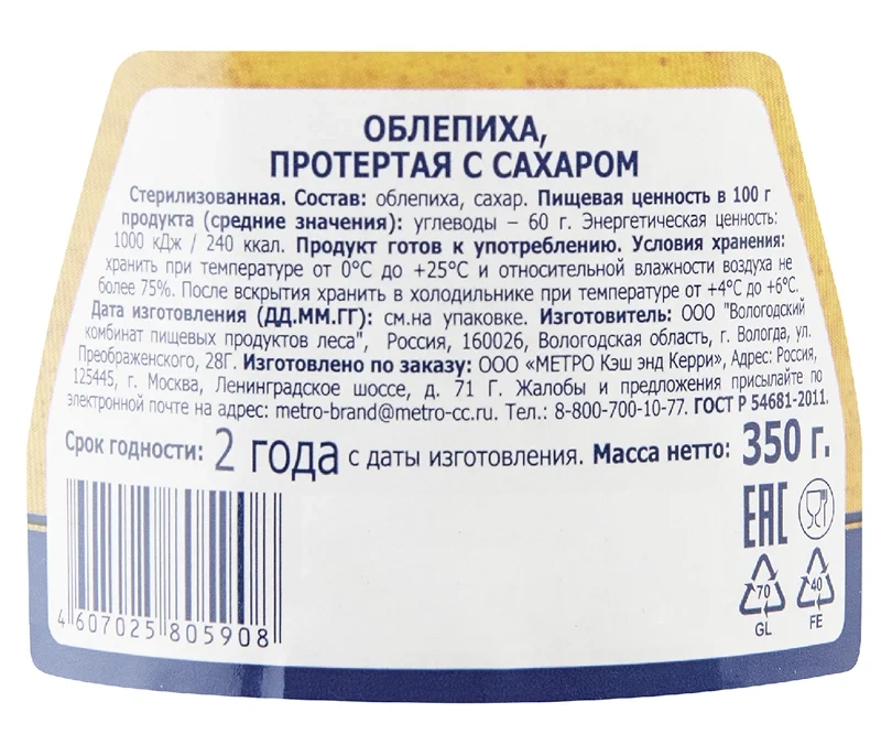 Облепиха протертая с сахаром, стерилизованная. Щадящий режим тепловой обработки, отсутствие искусственных консервантов, ароматизаторов и красителей, натуральный вкус и набор полезных микроэлементов в этом продукте из замечательной целебной ягоды.