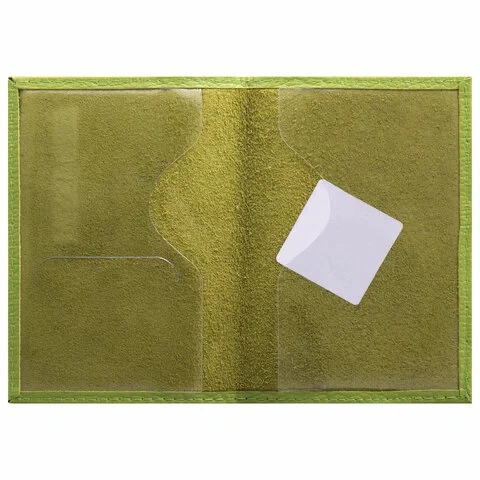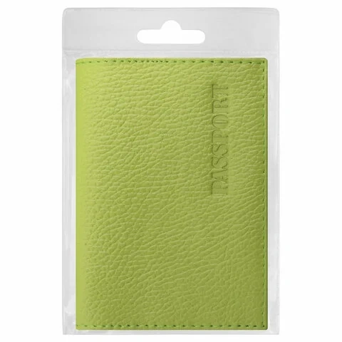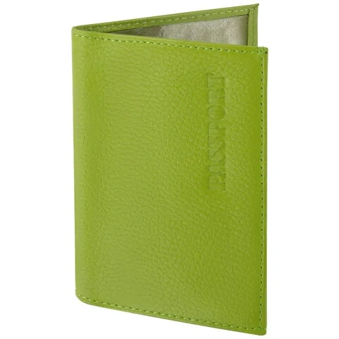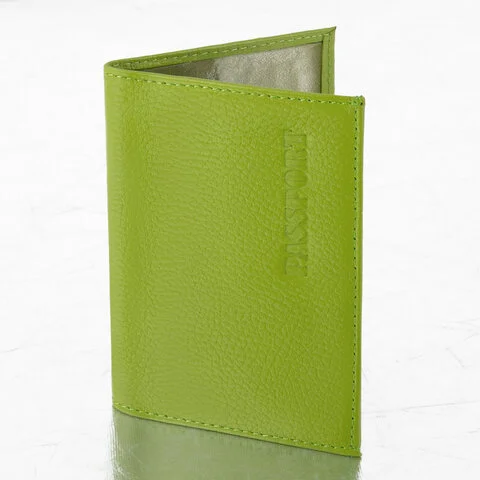 Модель выполнена из натуральной кожи флоттер салатового цвета и украшена тисненой надписью 'Паспорт'. Имеет простроченные края. Снабжена противокражным элементом. На внутреннем развороте расположены два кармана из прозрачного пластика. Благодаря компактным размерам 97х138 мм удобно всегда носить с собой.