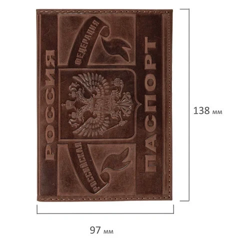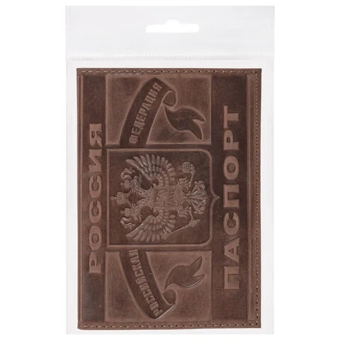 Обложка для паспорта натуральная кожа краст, герб РФ + 'ПАСПОРТ РОССИЯ', коньяк, BRAUBERG, 238210