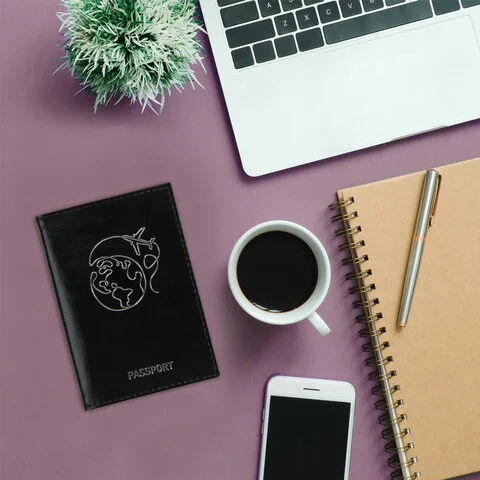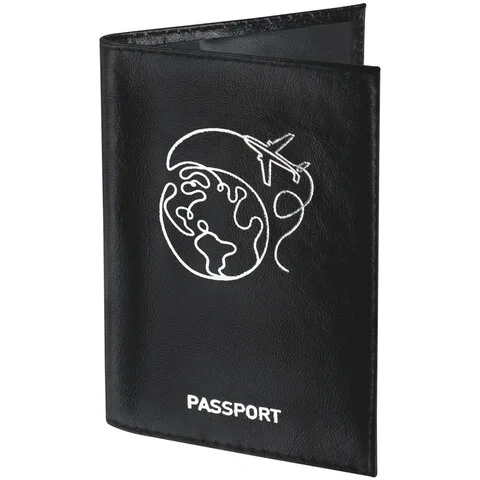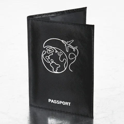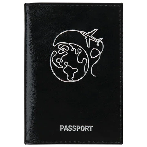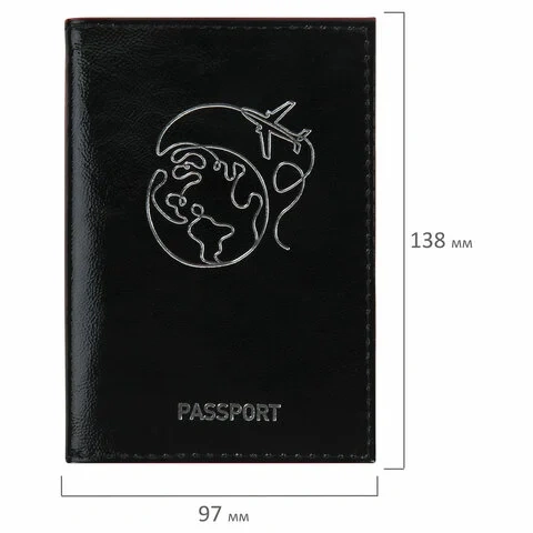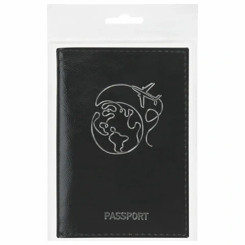 Модель выполнена из натуральной кожи 'наплак' чёрного цвета, что подчеркнет стиль и изысканный вкус обладателя. Украшена тиснением серебристой фольгой в виде земного шара с самолётом, тем самым подталкивая на путешествие. На внутреннем развороте расположены два кармана из прозрачного пластика. Упакована в пакет с европодвесом.