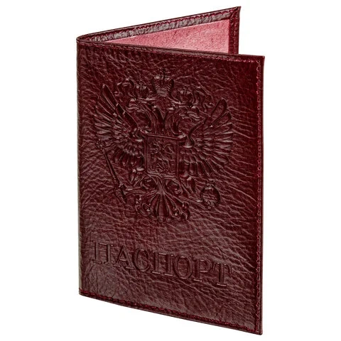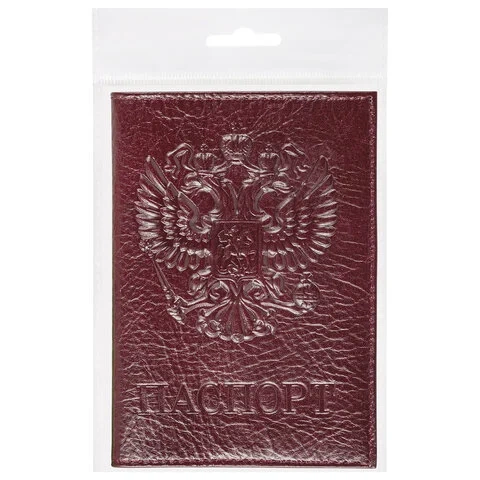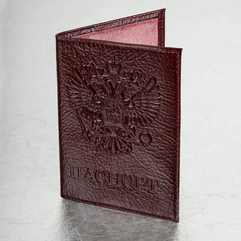 Модель выполнена из натуральной кожи глубокого темно-бордового цвета, что подчеркнет стиль и изысканный вкус обладателя. Украшена тисненой надписью 'Паспорт' с государственной символикой 'Герб', края прострочены. Снабжена противокражным элементом. На внутреннем развороте расположены два кармана из прозрачного пластика. Размер - 97х138 мм. Упакована в пакет с европодвесом.