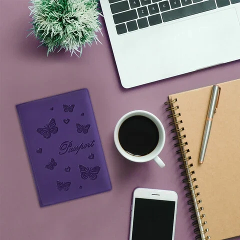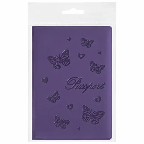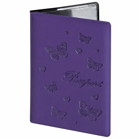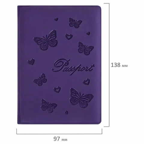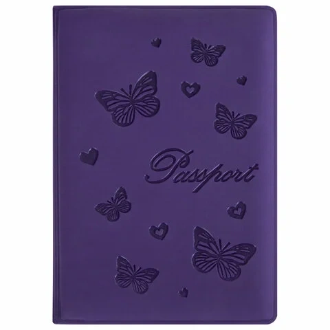 Модель выполнена из бархатного полиуретана фиолетового цвета, украшена изображением бабочек и тисненой надписью 'Паспорт'. На внутреннем развороте расположены два кармана из прозрачного пластика. Благодаря компактным размерам 97х138 мм удобно всегда носить с собой.