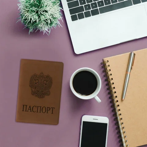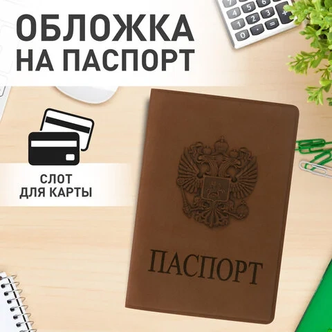 Модель выполнена из мягкого полиуретана светло-коричневого цвета, украшена гербом Российской Федерации и тисненой надписью 'Паспорт'. На внутреннем развороте расположены два кармана из прозрачного пластика. Благодаря компактным размерам 97х138 мм удобно всегда носить с собой.