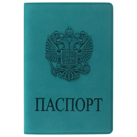 Модель выполнена из мягкого полиуретана темно-бирюзового цвета, украшена гербом Российской Федерации и тисненой надписью 'Паспорт'. На внутреннем развороте расположены два кармана из прозрачного пластика. Благодаря компактным размерам 97х138 мм удобно всегда носить с собой.