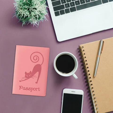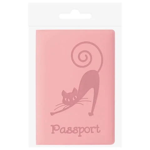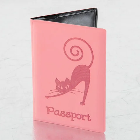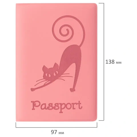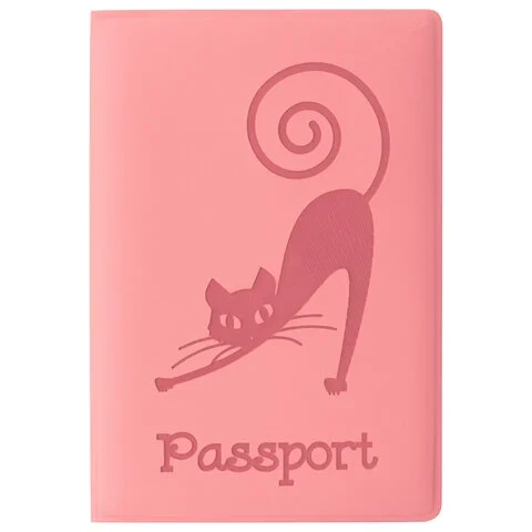 Модель выполнена из мягкого полиуретана яркого персикового цвета, украшена изящной кошкой и тисненой надписью 'Паспорт'. На внутреннем развороте расположены два кармана из прозрачного пластика. Благодаря компактным размерам 97х138 мм удобно всегда носить с собой.