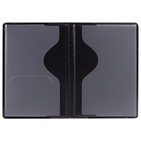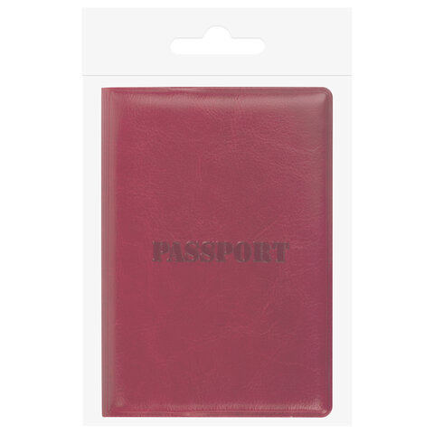 Модель выполнена из полиуретана, напоминающего кожу бордового цвета, и украшена тисненой надписью 'Паспорт'. На внутреннем развороте расположены два кармана из прозрачного пластика. Благодаря компактным размерам 97х138 мм удобно всегда носить с собой.