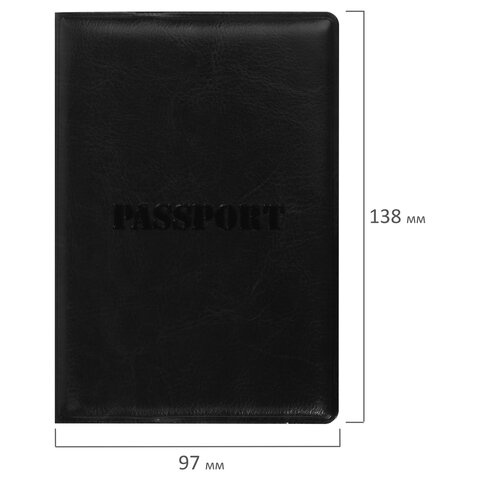 Модель выполнена из полиуретана, напоминающего кожу черного цвета, и украшена тисненой надписью 'Паспорт'. На внутреннем развороте расположены два кармана из прозрачного пластика. Благодаря компактным размерам 97х138 мм удобно всегда носить с собой.