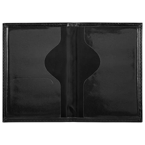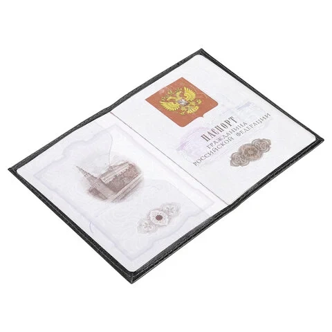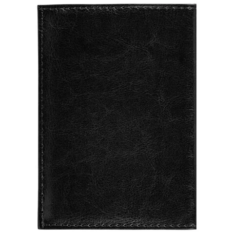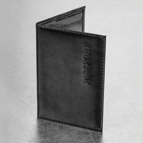 Модель выполнена из экокожи черного цвета и украшена тисненой надписью 'Паспорт'. Имеет простроченные края и мягкую изолоновую вставку. Снабжена противокражным элементом. На внутреннем развороте расположены два кармана из прозрачного пластика. Благодаря компактным размерам 97х138 мм удобно всегда носить с собой.