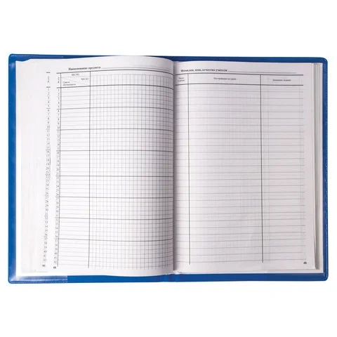 Непрозрачная плотная обложка ПИФАГОР синего цвета с золотым тиснением для классного журнала изготовлена из картона плотностью 235 гр/м2 и поливинилхлорида (ПВХ) толщиной 250 мкм. Размер 305х475 мм. Традиционная, с двумя клапанами, без возможности регулировки по ширине.
