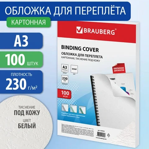 Обложки для переплета картонные Brauberg белые, А3, 230 г/кв.м, 100шт