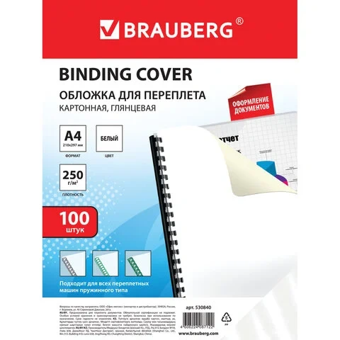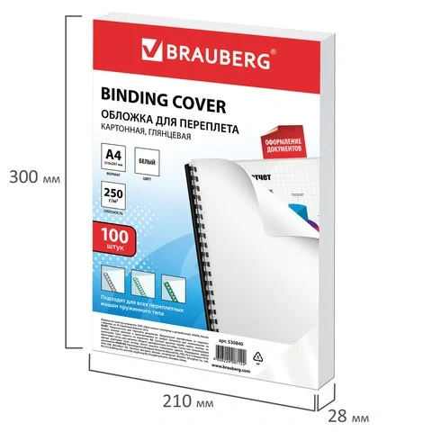 Обложки для переплета картонные Brauberg белые, А4, 250 г/кв.м, 100шт, глянцевые