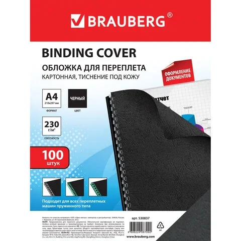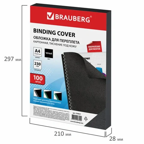 Выполнены из прочного, износостойкого картона черного цвета плотностью 230 г/м2. Тиснение под кожу. Подходят для документов формата А4. 100 штук в комплекте.
