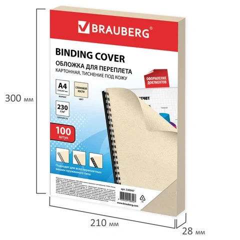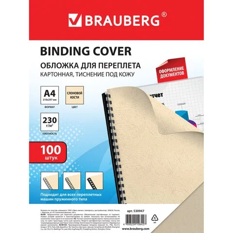 Обложки для переплета картонные Brauberg слоновая кость, А4, 230 г/кв.м, 100шт